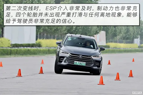 唐DM的最大入桩速度为67.5km/h,能够承受最大0.976g的侧向加速度。唐DM由于电池组的缘故,车辆的重心要比一般SUV都要低,所以在紧急变向时,车身更稳定,同时坚韧的悬架及出色的底盘刚性使得该车的质心转移非常快,驾驶起来更得心应手。