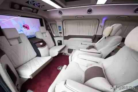全车采用劳斯莱斯同款定制的植绒高档地毯,每一脚上去可都是人民币啊,第二排BOSS座椅采用的是航空头等舱按摩座椅,舒适度不言而喻,不仅带有按摩功能,还带一键式躺平,加热通风等实用性的配置,这款座椅还有个特殊的功能,那就是它可以180度旋转,跟后排三连座拼成一个简单的会议模式,中间可手动支起一个高档商务桌,这样就可以开个简单的商务会议或者来局放松心情的四人麻将了。