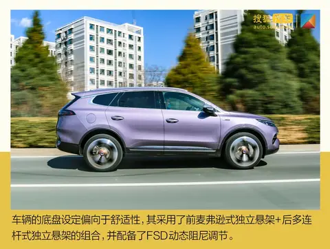 车辆的底盘设定明显偏向于舒适性调校,其采用了前麦弗逊式独立悬架+后多连杆式独立悬架的组合,并配备了FSD动态阻尼调节,可以根据路况进行悬挂的软硬调节。在大多数时间,腾势X PHEV都能够很好地过滤路面上的振动,不过在余振的处理上还有提升空间。