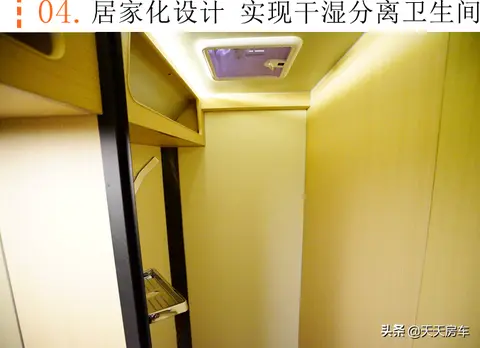 国内房车普遍使用的塞特福德旋转马桶、进口水泵、不锈钢水龙头、淋浴花洒、双向换气扇、化妆镜带触摸灯、吊柜及碰触开关一应俱全。
