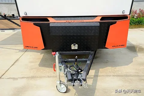 牵引部分,一体式整理工具箱与整车箱体独立镶嵌,其中,前部开口为柴油暖风的油箱及液化气罐存储区,左侧为外置整理箱、右侧为汽油发电机安放处。尤其是与前车连接部分,首次采用万向节连接装置,电路连接部分采用美规7针接口且配置了电磁刹车系统,离地间隙590mm,以区别其他同类车型。