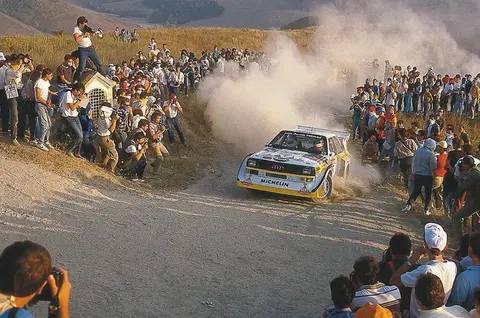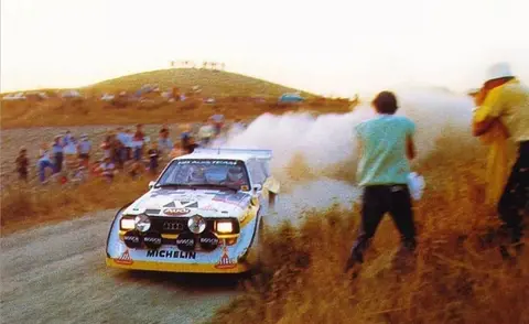 以1985年沃尔特·罗尔(WalterRöhrl)在当年的圣雷莫(Rally San Remo)上的这张照片为例(顺便说一句,这也是quattro在WRC的最后一场胜利)。这张照片是S1 E2最著名的镜头之一,它传达出了奥迪车的野蛮优雅,以及罗尔(Röhrl)和副驾驶克里斯蒂安·盖斯特多夫(ChristianGeistdörfer)坚定的表情,通过挡风玻璃可以清晰地看到这两位车手。在他们的身后,围观的车迷们都被刚刚被奥迪征服过的地形所扬起的尘土吞噬。