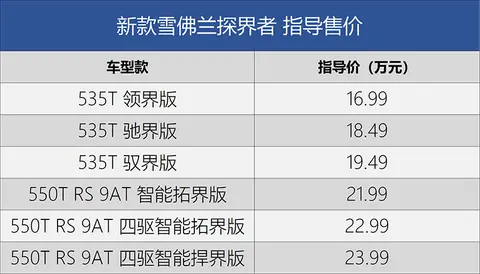 今年9月份,新款雪佛兰探界者就已上市,全系共提供6款车型,售价区间为16.99-23.99万元,整体价格相比老款车型便宜了5000元左右,如此来看还是挺有诚意的。其中535T车型搭载1.5T发动机,均为前驱车型,当来到550T车型之后,不仅换装了2.0T发动机,提供RS车身套件,在两款高配车型上还提供有四驱系统,本次试驾车型为顶配版本。