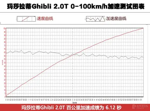 官方给出2.0T玛莎拉蒂Ghibli的0-100km/h加速时间为5.7秒,我们实测的0-100km/h加速时间为6.12秒,比官方成绩慢了0.42秒,结合高温、路况以及轮胎状态等条件,成绩与官方基本无异,0-60km/h加速时间仅为2.94秒。