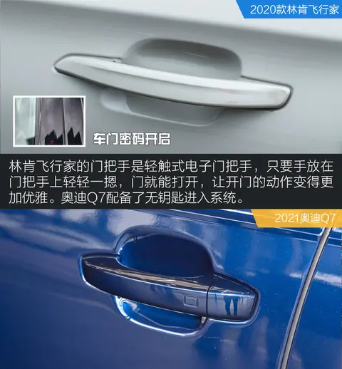 林肯飞行家进入车辆还有Lincoln SecuriCode® 车门密码开启系统、PAAK智能蓝牙手机钥匙,可以通过手机进入车辆,并且可以远程启动车辆。奥迪Q7则只有传统的无钥匙进入。
