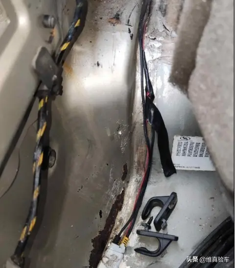 再看纵梁情况。右后侧纵梁存在变形的情况。看到这儿,我感觉也没有继续看下去的必要了。找到了客户,将这个车的一个情况反馈给了他:漆面钣金修复外,除了右A柱做漆,其他几个柱面都是变形且钣金做漆,而且右侧纵梁变形。而且后围板更换,而且内饰底部有泥沙进水痕迹但是没有漫过门槛。所以可想而知,这车注定成交不了!