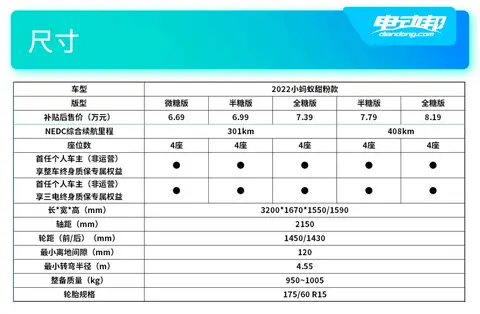 所以综合考虑的话,我们认为全新小蚂蚁最值得关注和推荐的是售价在8.19万的408km全糖版,因为只有它能同时兼顾续航和配置。当然如果预算有限的话就需要分两种情况了,如果301km续航能够满足日常需求,那么301km半糖版配置最具性价比;如果还是更要续航的话,那还得是408km续航的半糖版。