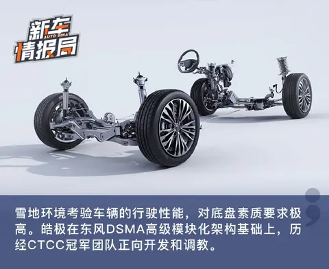 雪地环境考验车辆的行驶性能,对底盘素质要求极高。皓极在东风DSMA高级模块化架构基础上,历经CTCC冠军团队正向开发和调教。东风集团DSMA架构是东风汽车集团整合全球优势资源,面向中高端车型的高级模块化架构,具备多维高效、燃擎驾享、进阶智能三大优势。