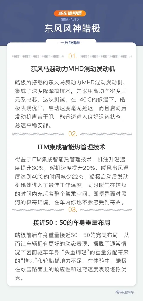 首先是动力方面,皓极所搭载的东风马赫动力MHD混动发动机,集成了深度降摩擦技术,并采用高功率密度三元系电芯,这次测试,在-40℃的低温下,皓极表现优异,启动速度毫无延迟,而且启动后发动机声音干脆,能迅速进入良好的运转状态,怠速平稳安静。