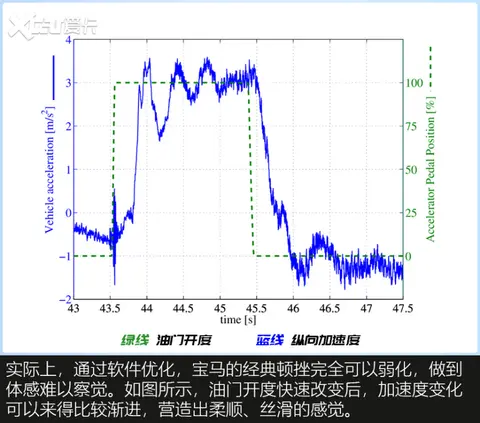 谈理论似乎有些空洞,不如举几个例子,说明“发变匹配”的重要性。在许多搭载纵置8AT的宝马车型上,低速蠕行偶尔会出现顿挫。具体表现是,小油门起步,并将车速维持在15-20km/h一段时间后,突然松开油门(tip-out),车子会出现连续几下高频振荡(jerks)。这种振荡速度很快,且逐渐收敛,类似于手动挡车型1挡低速突然收油的顿挫。有人说,变速箱应该为此背锅。事实果真如此吗?