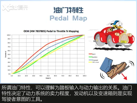 人们日常所说的动力响应,不仅涉及上面提到的加速及时性,还包含了油门特性。所谓油门特性(pedal map),是指加速踏板行程与动力输出之间的关系。踏板每踩下1%,发动机出多大力,直接影响到驾驶者对动力的感受。此外,变速箱作为减速增扭装置,用来调节发动机工况。根据油门输入(行程/变化率)、刹车输入(行程/变化率)、发动机负载水平等条件的不同,变速箱会自动选择合适挡位,提供驾驶者需要的加速力道。