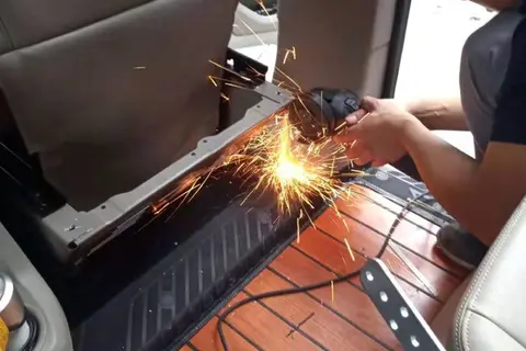 最后,改装的实际操作步骤。这个前排脚托的改装基本就是简单的机械机构连接固定,只不过由于原车并没有预留加装的位置,需要用到切割机开孔,这个操作需要一定的技术。