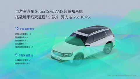 SuperDrive AAD超感知系统将配置12颗超高清摄像头,其中包括2颗800万像素的前视高清摄像头、4颗环视摄像头、4颗侧视摄像头、1颗后视摄像头及1颗驾驶员感知摄像头,配合5颗毫米波雷达,可实现高速公路和城区道路的NOA功能,满足复杂路况下的辅助驾驶信息获取需求,以及更多场景下的全自动泊车等功能。