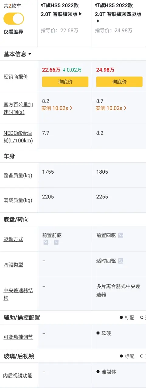 智联旗领四驱版对比智联旗领版,价格+2.3万元,前置前驱升级为前置适时四驱,普通悬挂升级为软硬可调悬挂,内后视镜多了流媒体功能,这些配置不值得2.3万元,不建议升级。