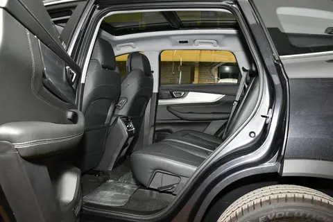 奇瑞瑞虎8 PLUS鲲鹏e+前脸部分采用几何矩阵钻石前格栅,外面一圈镀铬饰条包围,两侧为LED晶体前大灯+流水转向灯以及双光刃高亮日间行车灯。这套大灯配备了自动大灯,整个车头看起来极具设计感。车身侧面首先车顶上方是车顶行李架,车门中部一根硬朗的腰线贯穿,下方采用一个内凹设计搭配镀铬饰条点缀着235/55 R18轮胎。来到车尾最上方依旧是一个大尺寸的扰流板设计中间镶嵌着高位刹车灯,下方中间是吉利字母车标搭配两侧晶钻阵列后尾灯+流水转向灯,最下方一根镀铬饰条贯穿着双边共双出的排气,整个车尾看起来很有力量感。