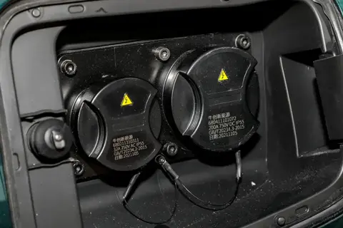 车身侧面造型比较方正,平直的车顶的线条保证了内部充足的头部空间,腰线前部分比较圆润,后半部分就比较硬朗了。熏黑处理的B/C柱还营造出了悬浮式车顶的视觉效果,而且在C柱处的镀铬装饰处还集成了LED灯带,能够在充电时显示状态。前后车门把手采用了隐藏式设计,搭配下方大尺寸的多幅式轮圈,运动效果营造得非常到位。车身尺寸方面为4915*1962*1755mm,车身轴距为2910mm。