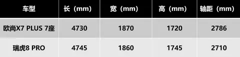 车身尺寸方面,欧尚X7 PLUS 7座的长宽高分别为4730*1870*1720mm,轴距则为2786mm;瑞虎8 PRO的长宽高分别为4745x1860x1745mm,轴距为2710mm。直观比较下来,可以看到虽然瑞虎8 PRO在车身三围数据上稍微占优,但欧尚X7 PLUS 7座则是在更为关键的轴距数据上取得了优势,这便意味着后者的车内实际可用空间会更大。