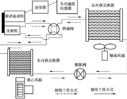 空调系统的制冷/制热模式由四通换向阀转换,实线箭头表示制冷工况,虚线箭头表示制热工况。从原理上讲,该系统与普通的热泵空调并无区别,但是用于电动汽车上,其专门开发了双工作腔滑片压缩机、直流无刷电动机和逆变器控制系统,这种方案是通过热泵来实现。