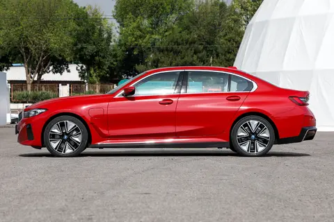 车身侧面,蔚来ET5的溜背造型十分显眼,红色刹车卡钳则带来了较强的运动范;宝马i3造型饱满,腰线的设计十分灵动,轮圈的样式也十分特别,造型上指向了中间的宝马LOGO。