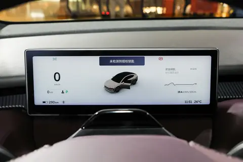 内饰方面,蔚来ET5延续了简洁的设计风格,中控台一览无遗,除了两块大屏和令人熟悉“小圆脸”,并无其他刻意的装饰。两块大屏中,液晶仪表的尺寸为10.2英寸,风格上比较清新,而中控屏尺寸为12.8英寸,竖置的布局带来了较好的可视化面积,分辨率和清晰度都比较突出。