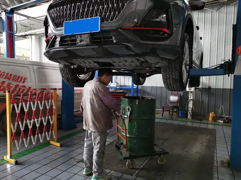 放完旧机油,换好机滤之后,就把车子从举重机上放了下来,接着加新机油。