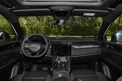 领克01 PHEV内饰方面中控台上方采用大面积软质材料包裹,下方仪表台采用一块为12.3英寸的全液晶仪表搭配真皮包裹的多功能方向盘,整个方向盘握起来手感比较运动。中间采用空调出风口贯穿设计搭配一块嵌入式12.8英寸的中控大屏,整个内饰的用料比较高端。