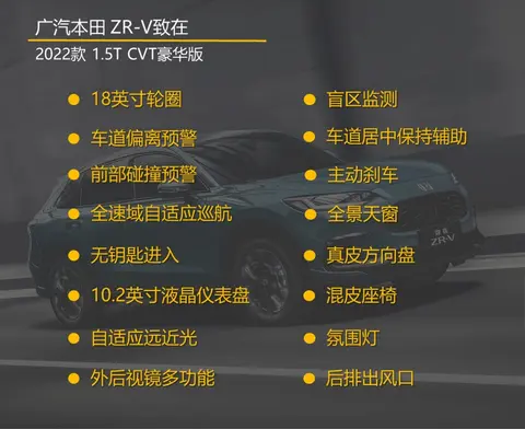 功能配置方面,ZR-V致在全系标配8安全气囊(顶配10安全气囊)、可变转向比、10.1英寸中控屏、泊车影像、一键启动、LED大灯、自动空调等,满足基本了用车需求。同时,拥有一些高阶配置,比如Honda SENSING,支持盲区监测、前部碰撞预警、主动刹车、自适应巡航、车道偏离预警/保持辅助等等,达到L2的级别。10.2 英寸液晶仪表盘,在本田车型上比较少见。数字钥匙,可以通过智能手机解锁、锁定、启动车辆。BOSE音响,搭载12扬声器,打造环绕立体声音效。