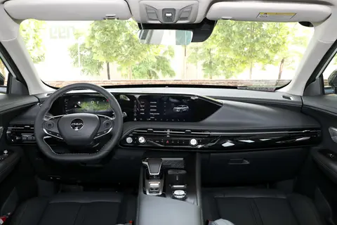车内,平底式的方向盘采用两辐设计,连贯的屏幕,分别为12.3英寸液晶仪表盘+12.3英寸液晶中控屏幕。在中控屏幕右侧形成夹角,形成一个缓坡延续向副驾驶。挡把略显宽阔,中控下方排列了简洁干净的物理按键和旋钮。