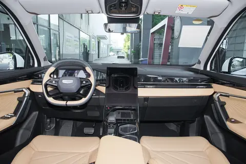 吉利博越L中控台上方采用大面积皮质带缝线包裹,下方采用一块为10.25英寸全液晶仪表和一块13.2英寸中控屏,方向盘则采用仿皮包裹的平底式多功能方向盘,整个内饰看起来极具科技感。