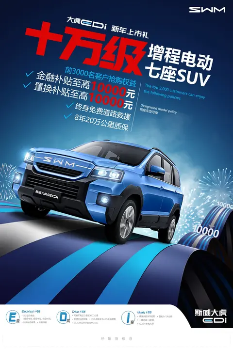 作为一款十万级增程电动七座SUV,斯威大虎EDi的出现,也意味着曾经让普通消费者望尘莫及的增程动力汽车,将陆续飞入寻常百姓家。同时新车上市,斯威汽车发出多项优惠政策冲击市场,让更多的消费者能够以更优惠的价格买到心仪的产品。