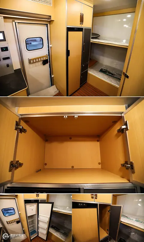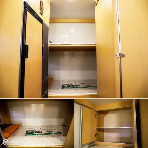 乘客门左手边为冰箱/衣柜收纳区,上方内部空间非常充裕,可叠放衣物。下方一侧则是150L冰箱,冷藏冷冻皆可;另一侧可悬挂衣服,防止衣服褶皱,下方同样留有独立的储物格便于收纳。其它生活配置包括40L家用热水器、驻车加热器、充电电源管理系统、行车充电管理系统、电源管理系统、智能贮压水泵套件、进口水路系统及快插。高配版可选特鲁马D6驻车加热器、特鲁马B14热水器、西门子洗碗机。