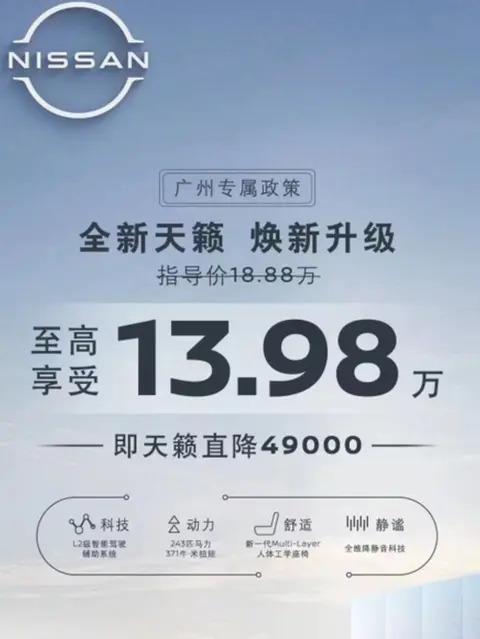 在大家以为燃油车补贴已经进入尾声或者已经取消时,有一家车企放出了王炸,这家车企就是日产汽车。根据日产放出的优惠显示,在广州地区日产天籁(图片|配置|询价)直接降了4.9万,中配车型只需要13.98万就能拿下。这款促销车型属于2.0L的中配车型,厂家指导价18.88万。