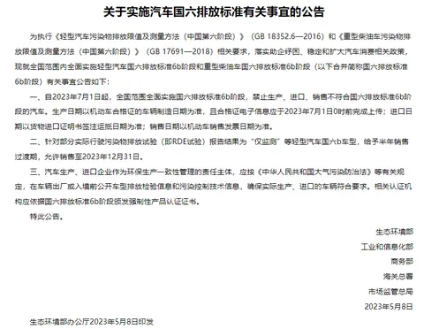日前,生态环境部、工业和信息化部、商务部、海关总署和市场监管总局联合发布了《关于实施汽车国六排放标准有关事宜的公告》,据公告内容显示,自2023年7月1日起,全国范围全面实施国六排放标准6b阶段,禁止生产、进口、销售不符合国六排放标准6b阶段的汽车。