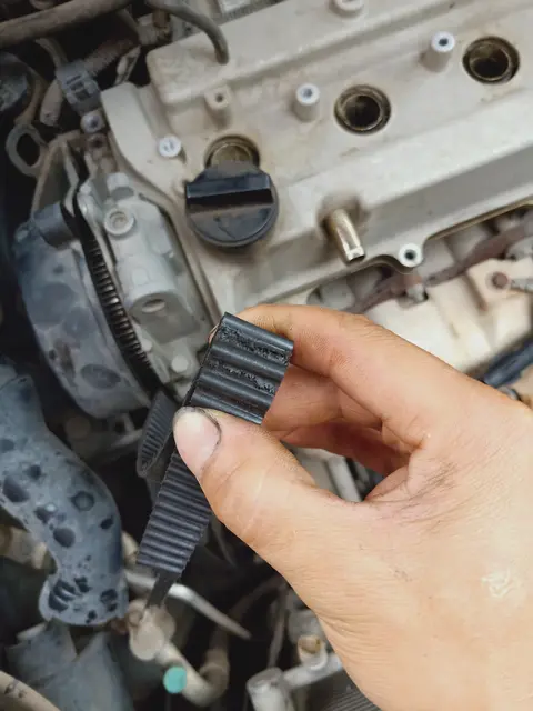 打开发动机舱,拆下正时壳 ,发现皮带早已断裂 ,这里要给大家讲清楚 ,什么是正时皮带,这个皮带和发电机皮带可不一样 ,发电机皮带断了无所谓 ,换一根就好 ,正时皮带断了 发动机就顶气门了 。