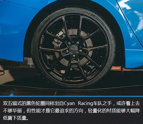 内饰部分的设计则更为“赛化”。除了中控台和中央通道的布局和配置适当保留之外,其余部分均作了大幅减重。比如前排座椅更换成支持6点式安全带的超轻桶椅,并且将后排座椅和车门饰板上的装饰和操控按键一并去掉,车窗为固定结构,无法开启。最终,该车成功在领克03+Cyan定制版的基础上减重150kg+。