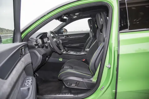 内饰方面也延续了普通版的设计风格,但整体设计更具运动氛围,采用大面积Alcantara材质包裹,配合亮眼的绿色点缀于安全带、方向盘回正环、换挡拨片、启动按钮、一体式运动座椅等部位,同时车内“+”号元素分布于方向盘、挡杆、中控台左侧及座椅之上。