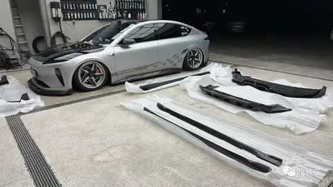 "新的轮毂换上后,还安排了TG design的碳纤维前唇、侧裙、后扰流、尾翼上车,经过这些外观部件的点缀后,让这辆ET5变得更加战斗。"