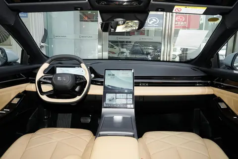 内饰方面,整个车内采用了极简的设计理念,而中控台经过平直线条勾勒之后则营造出了不错的层次感,并且在细节上加入了一条镀铬饰条进行点缀。在内饰材料上,它还是非常有诚意的,中控台表面大量覆盖了皮革或软性的材质,氛围灯还会有音乐、导航联动,质感还是相当好的。