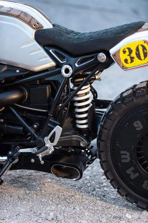 车辆前后都配备了180/55-17尺寸TKC80非铺装轮胎,为适应宽大的前轮重新打造了车轴和坚固的四螺栓下联板,后轮毂盖则由3D打印制造给人感觉像M60坦克的履带轮,手工集成尾灯的车尾和号码牌还有定制的排气、底盘护甲等等,车身上由方形塑胶制作的覆盖件代表了坦克上的反应装甲,其他的改装就不列举了,大家自行观赏。