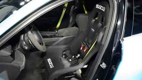 此外重量更沉的前排座椅也被拆除,取而代之的是两张来自Sparco的轻量化赛车桶椅。固定死的靠背角度以及手动前后调节的设计,相比此前至少能够减重40-60kg。在安全带部分,03+ TCR Cyan提供了两套配置,分别是更加安全的四点式安全带,以及符合上路法规的黄色三点式安全带。同时,车辆取消了四驱系统、侧气囊、气帘、驾驶辅助、天窗等一系列舒适性配置,最终相比起四驱的03+ Racing来说,03+ TCR Cyan足足轻了150kg,让车重达到了1495kg的水平。