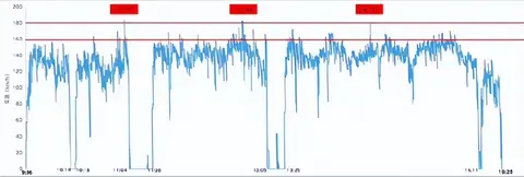 2、在整段高速行驶过程中,车速120-140km/h区间占比超过37%,车速140-160km/h区间占比超过46%,车速超160km/h占比超过4%;