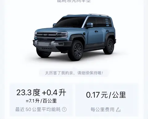 更有多位用户晒出豹5平均能耗后台数据截图,图片数据显示,豹5最近50公里平均能耗分别为23.3度+0.4L,综合能耗约等于7.1L/100km,平均每百公里费用0.17元和22.4度+0.1L,综合能耗等于6.5L/100km,平均每百公里费用0.16元。