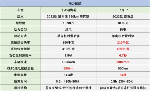 两款车型在20万以内要落地的话,比亚迪海豹我们选取指导价18.98万的2023款 冠军版 550km 精英型,飞凡F7选取指导价18.99万的2023款 都市版,两款车型之间仅相差100元,对比更具实际参考意义。