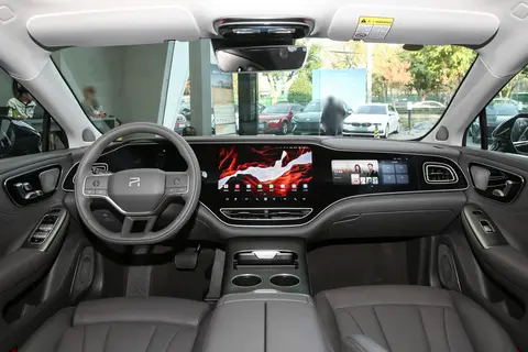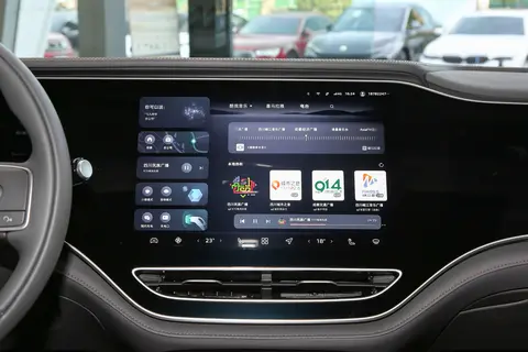 内饰设计:车内整体布局偏简洁,一目了然,比较吸睛的一体式三联屏和后排小屏幕也并没有删减,科技感十足。圆底式三幅式方向盘,按键设计为滚轮式,周围用了亮色镀铬条装饰,增加了些许精致感。中控台设计也比较实用,下方做了掏空设计,扩展了一定的储物空间。