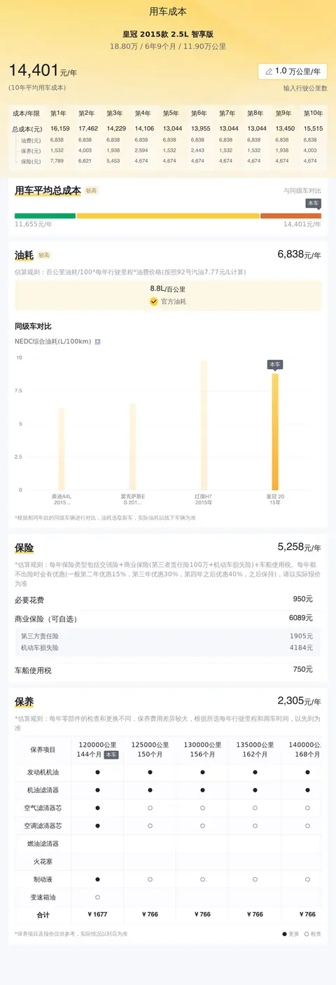 该款车系的用车成本中,年均油耗6776元/年,官方油耗为8.8L/百公里,年均保险费5258元/年,年均保养费2305元/年。十年平均用车成本14339元/年。