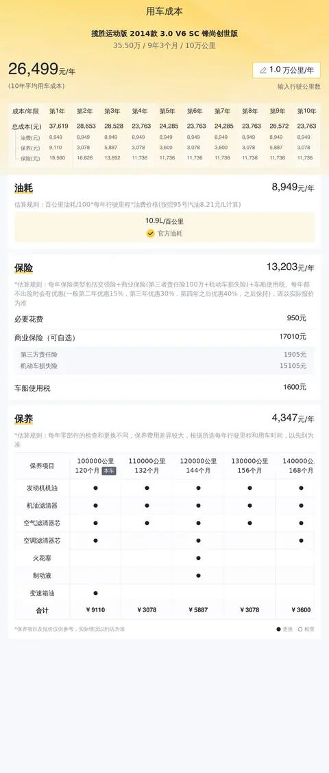 这款车的年均油耗为8938元/年,官方油耗为10.9L/百公里,年均保险费为13203元/年,年均保养费为4347元/年,十年平均用车成本为26488元/年。这些都是车主在使用车辆过程中需要考虑的成本。