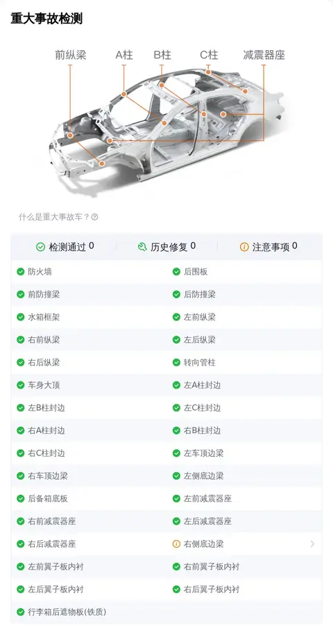 在事故排查部分,车辆的30项检测都通过了,但右侧底边梁有轻微变形,这是需要注意的部分。