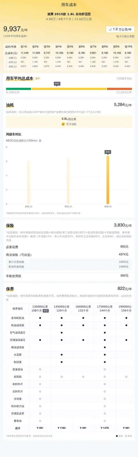 具体到用车成本,年均油耗为5236元/年,官方油耗6.8L/百公里,年均保险费3830元/年,年均保养费822元/年,十年平均用车成本9889元/年。