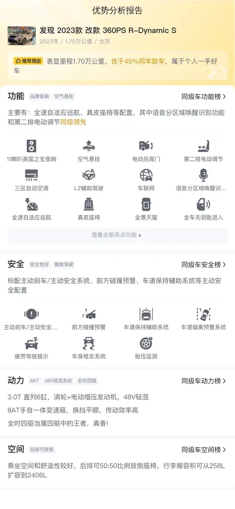 这款发现 2023款 改款 360PS R-Dynamic S的亮点配置主要体现在其搭载的3.0T 360马力 L6发动机,以及配备的8挡手自一体变速器,四驱驱动形式,这都是其在同级车中独具特色的地方。