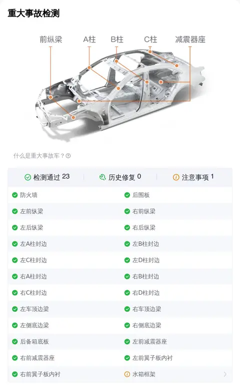 在事故排查部分,这款普拉多经过检测,23项通过,1项瑕疵,主要问题在水箱框架,存在钣金修复的痕迹。